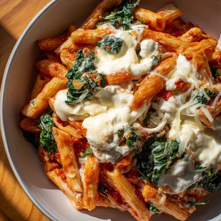 Save A rustic, comforting pasta bake featuring tender ziti, creamy ricotta, fresh spinach, and briny olives, all enveloped in a savory tomato sauce and finished with melted cheese.