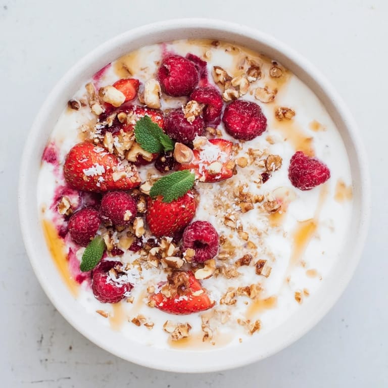 - Top with fresh berries, a generous drizzle of honey, toasted nuts, shredded coconut, and mint leaves if desired.