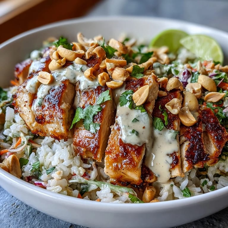 - Start with a generous base of fluffy grains, then arrange the sliced chicken, fresh vegetables, and leafy greens on top. Drizzle everything with that creamy peanut sauce until you're satisfied.